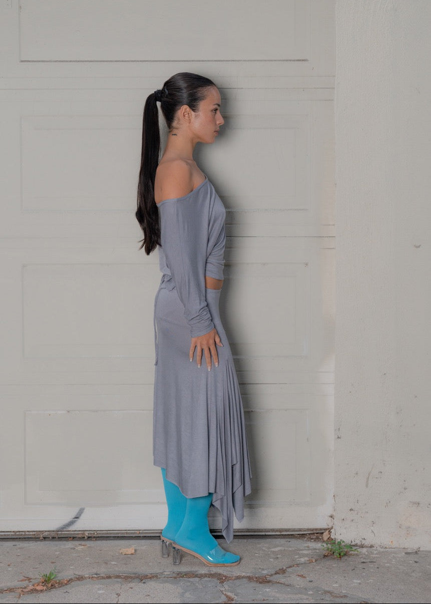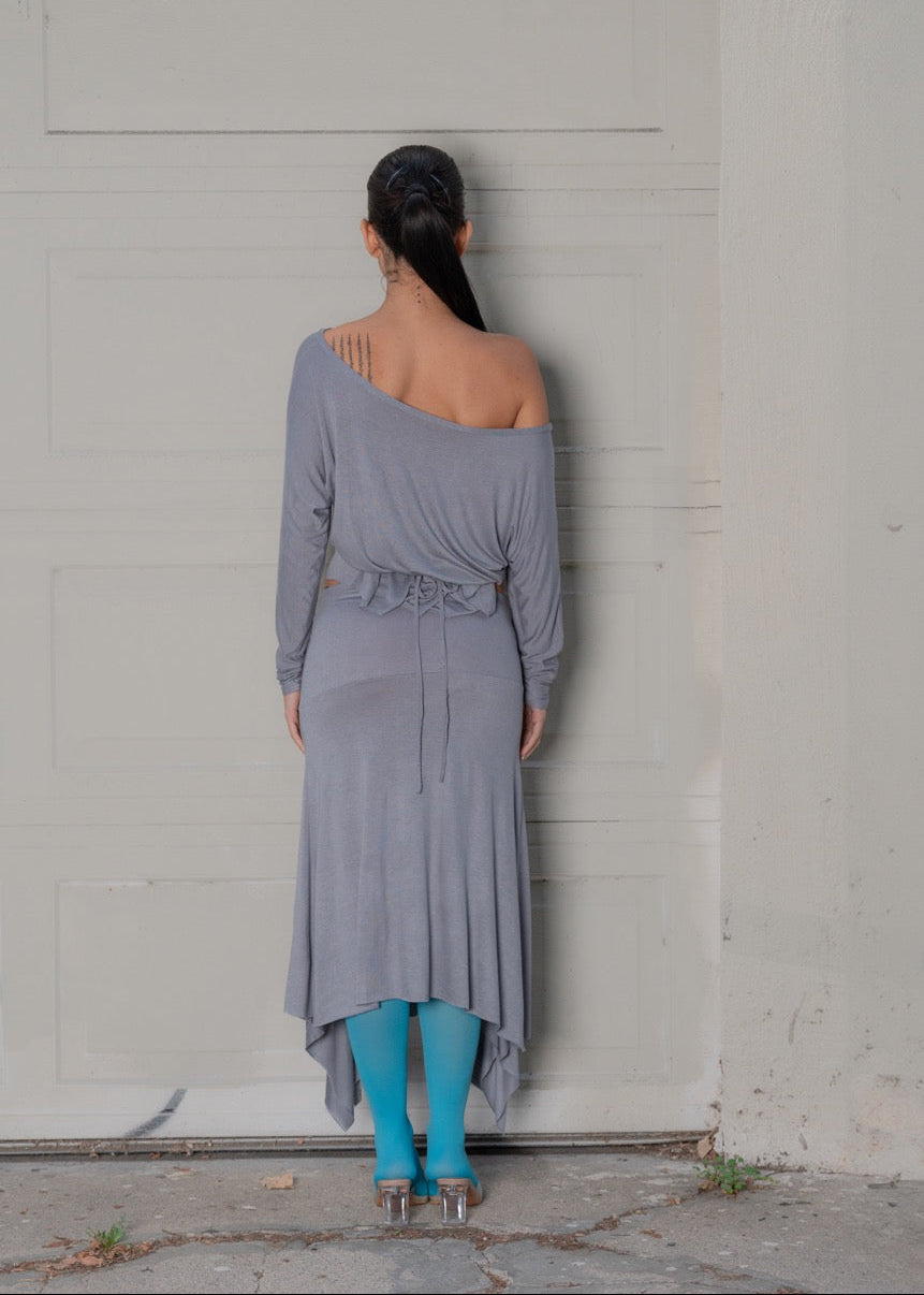 Long sleeve top with V neck and adjustable waist ties. Cut from our light weight, butter soft modal jersey. The 001 Top features a loose silhouette baggy silhouette that can be adjusted with ties. Designed to embrace the body in the most flattering way.